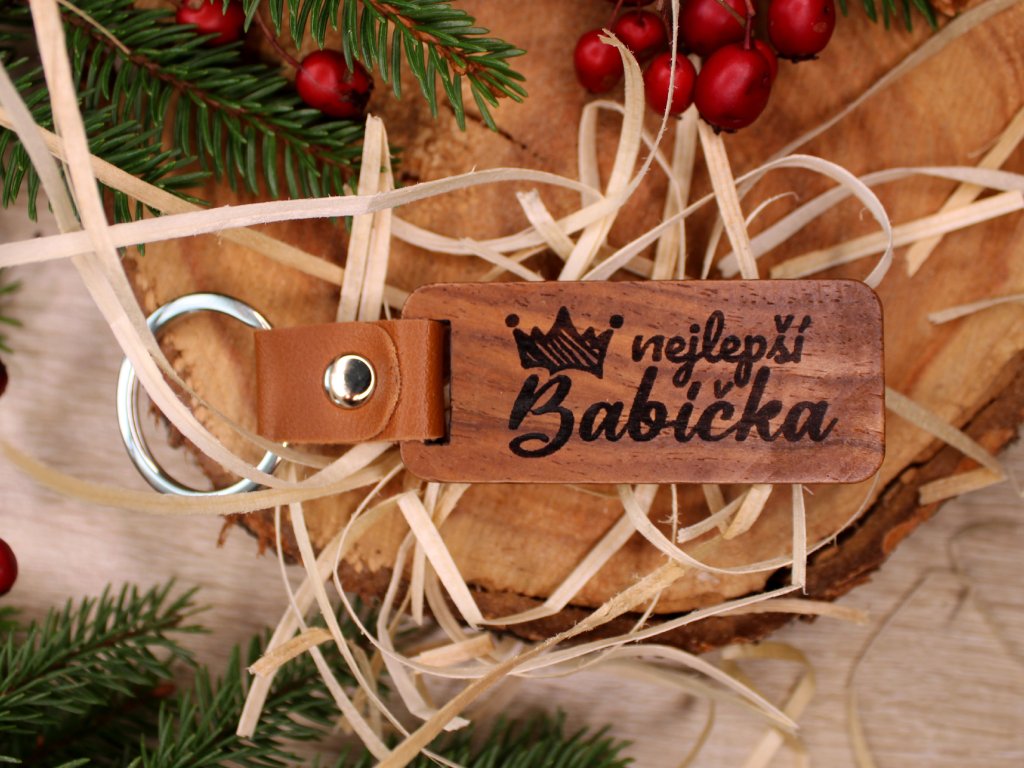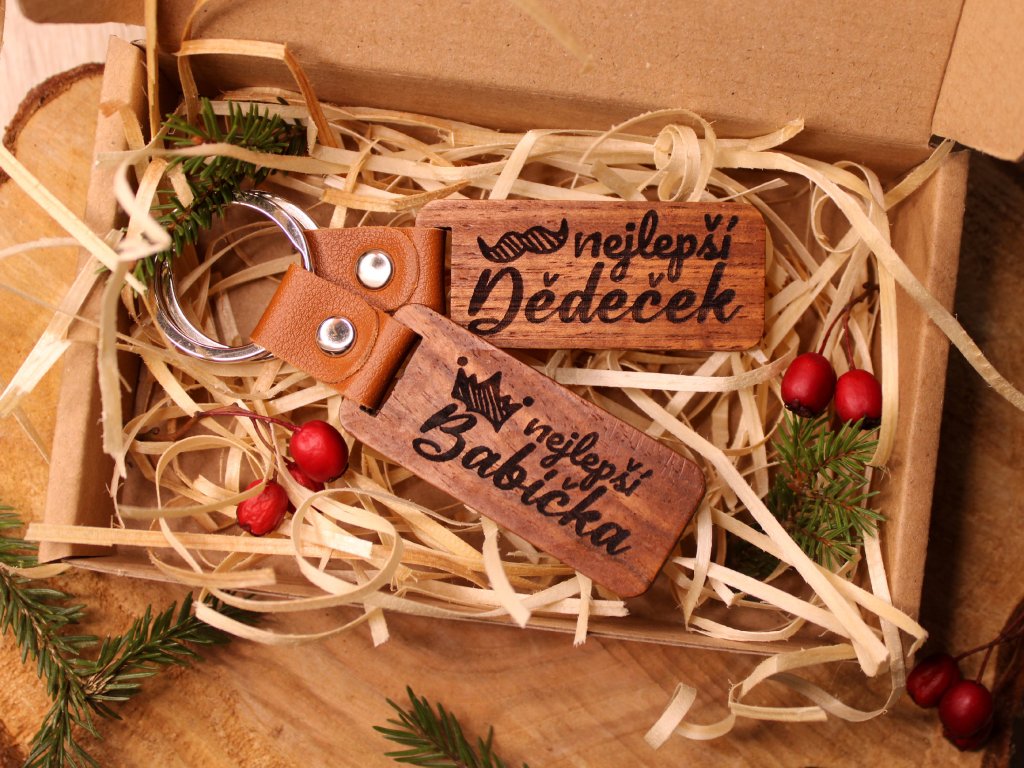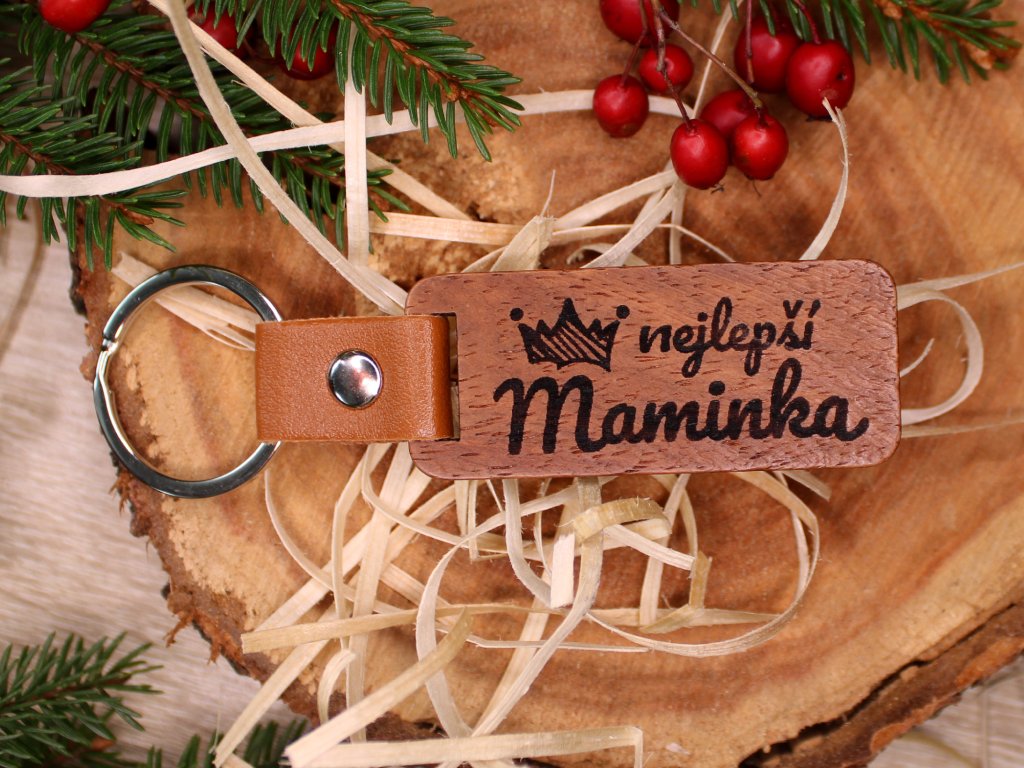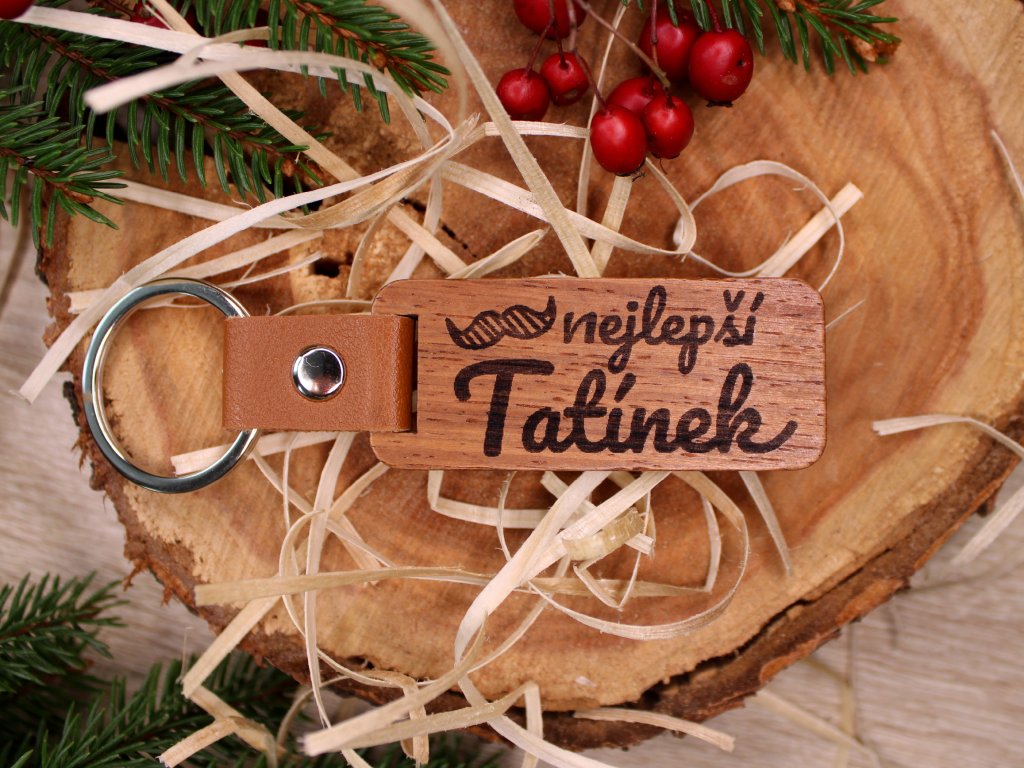 Dřevěná klíčenka s kůží a různými varianty. Text je gravírován pomocí laseru z obou stran.