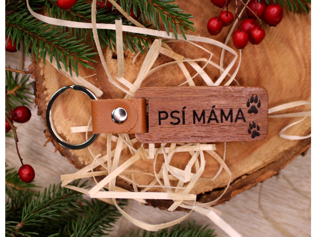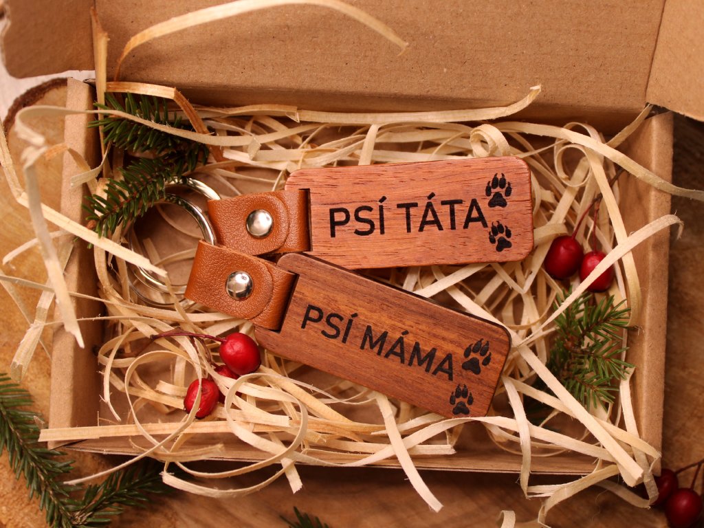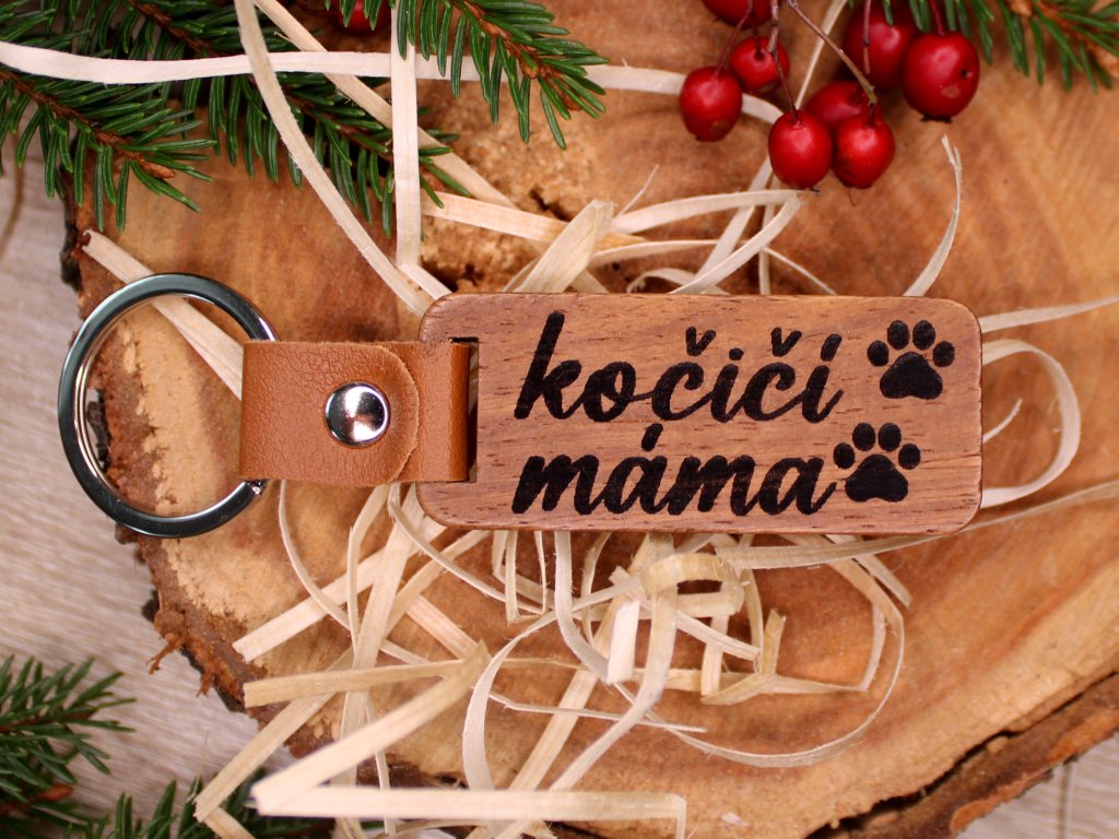 › Klíčenky › Dřevěná klíčenka s kůží - psí / kočičí máma, psí táta