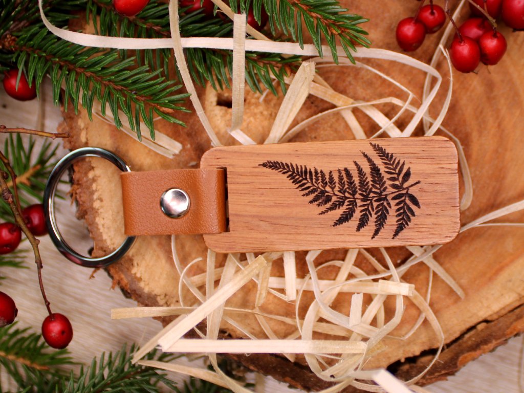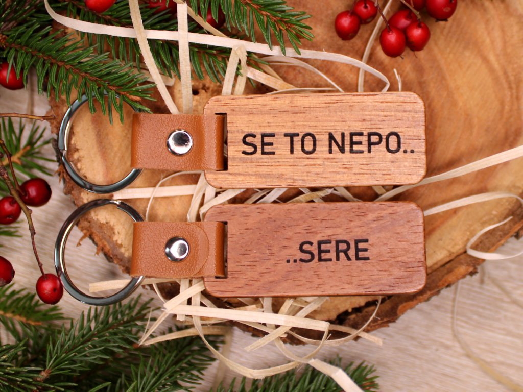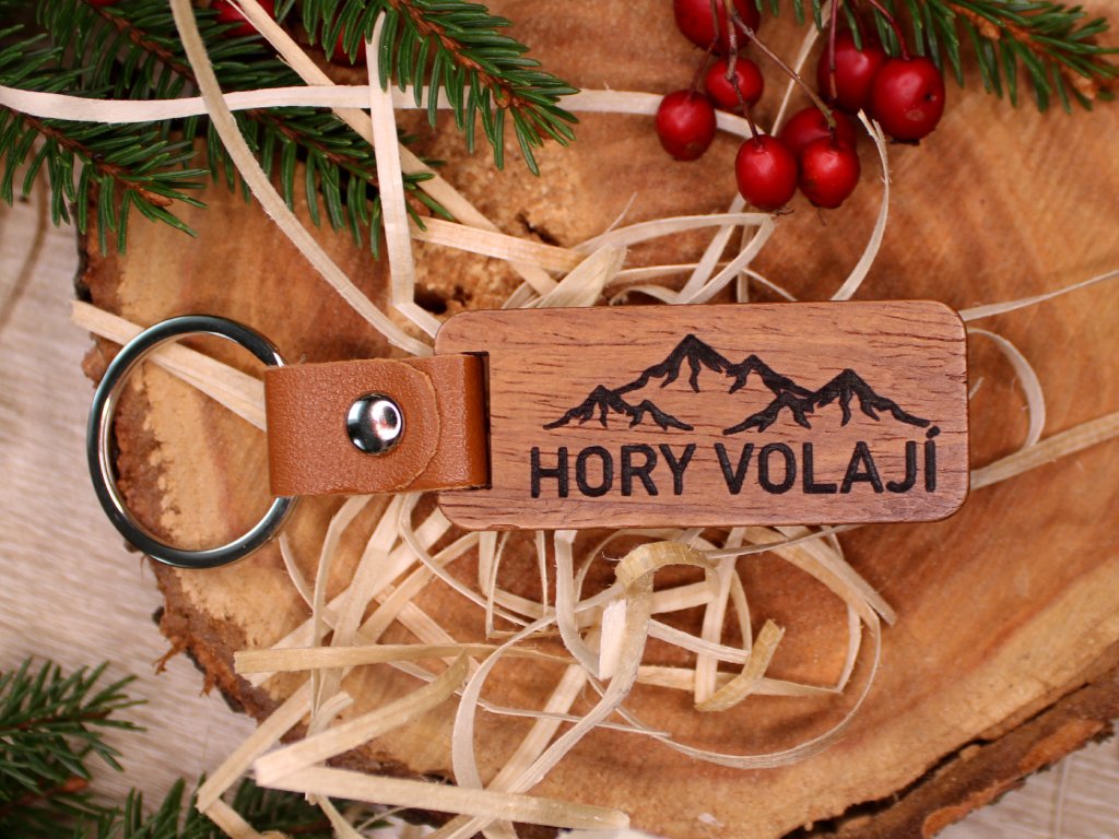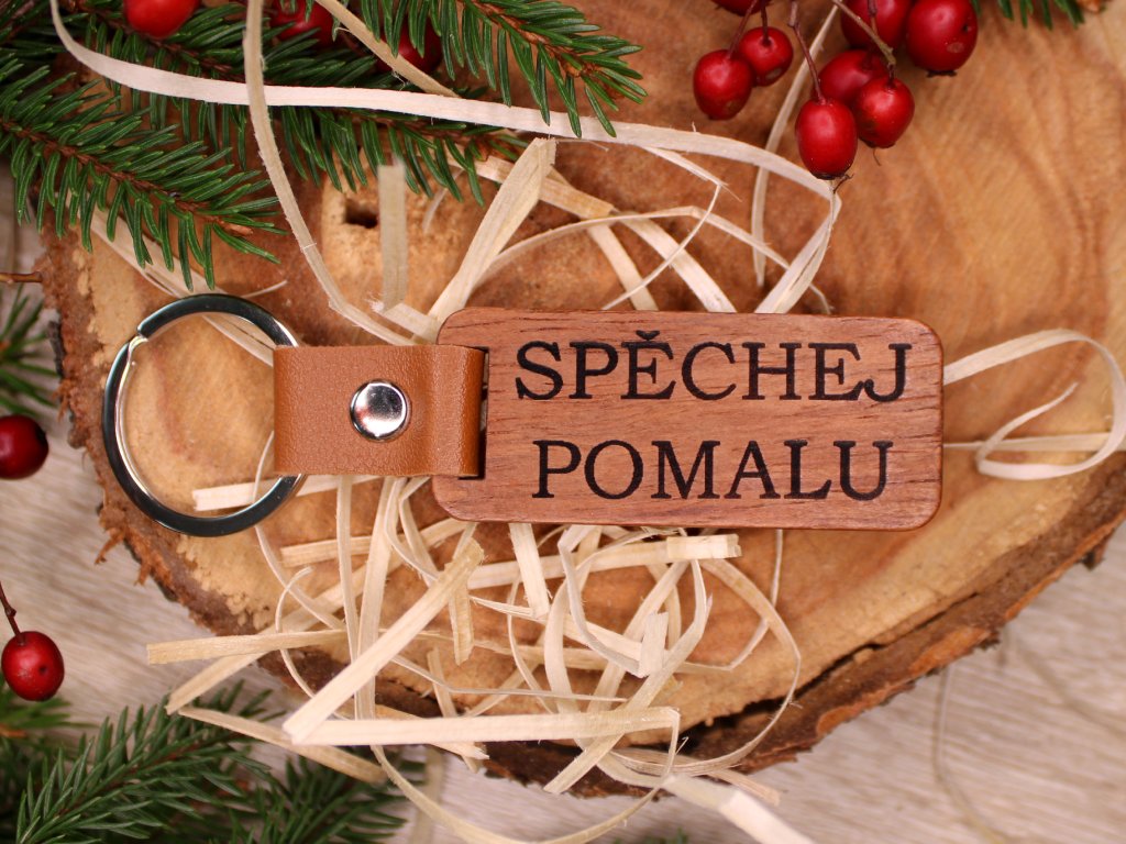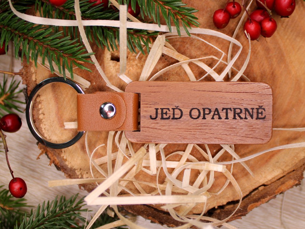 Dřevěná klíčenka s kůží a různými varianty. Text je gravírován pomocí laseru z obou stran.
