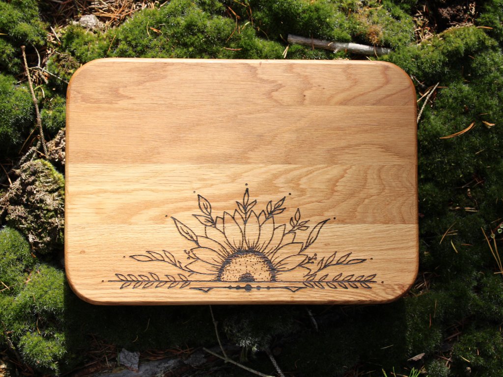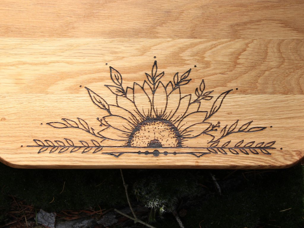 Dubové prkénko vhodné na krájení nebo servírování. Povrch je ošetřený směsí olejů a včelího vosku vhodných pro styk s potravinami. Na prkénko lze po domluvě vypálit náš nebo Váš motiv. V případě zájmu o vypálení motivu nás neváhejte kontaktovat a do objednávky zvolte variantu s vlastním textem nebo obrázkem.