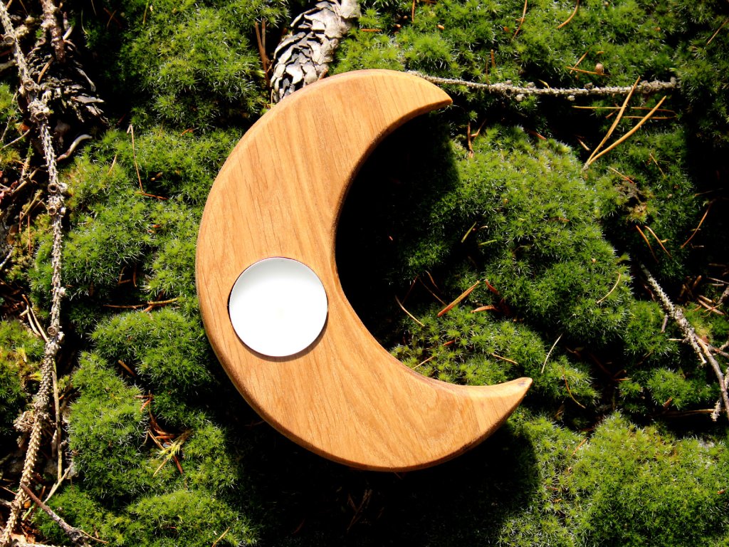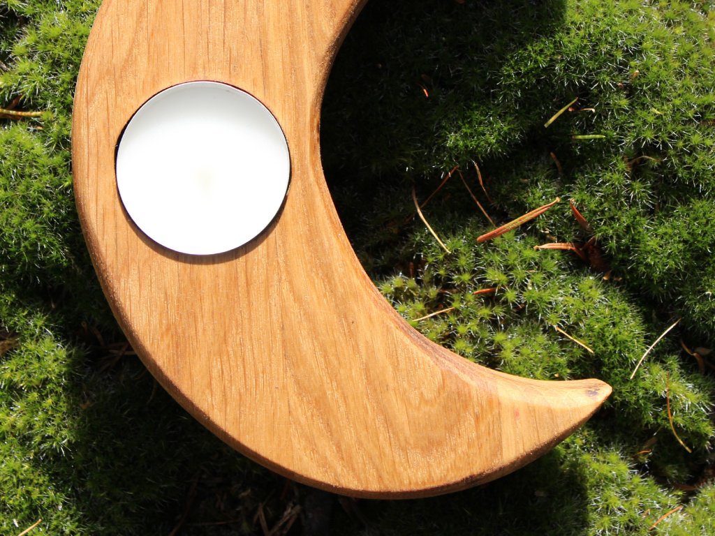 Dřevěný svícen ve tvaru měsíce na jednu čajovou svíčku. Povrch je ošetřený směsí olejů a včelího vosku.