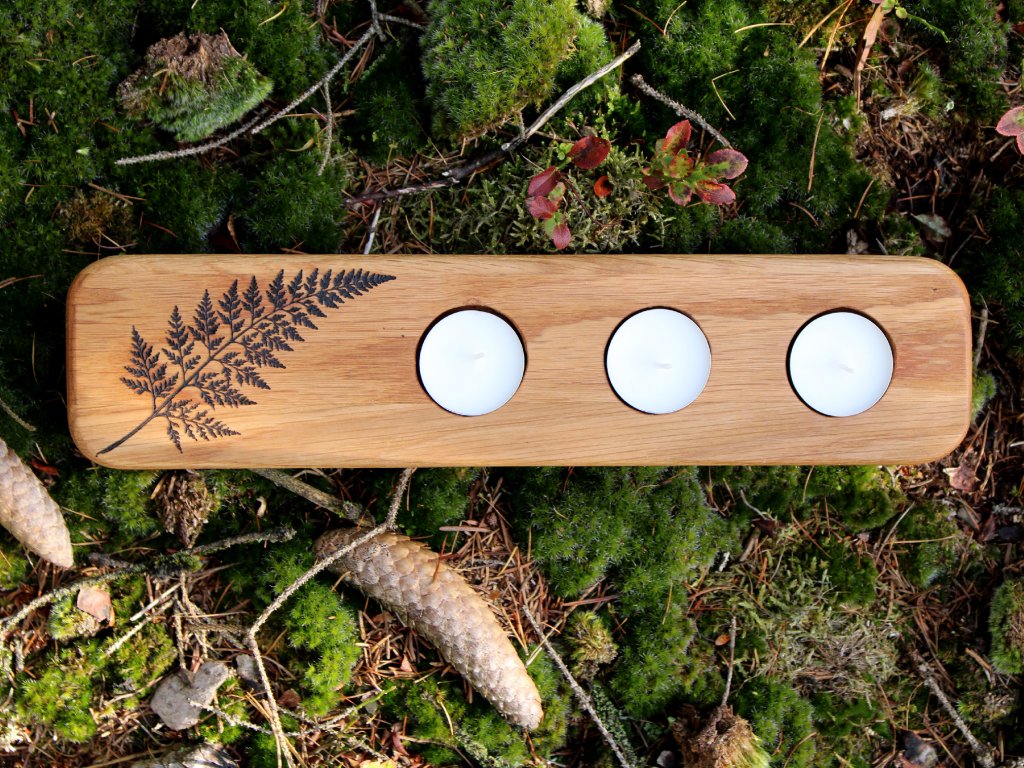 Dřevěný svícen na tři čajové svíčky. Povrch je ošetřený směsí olejů a včelího vosku.