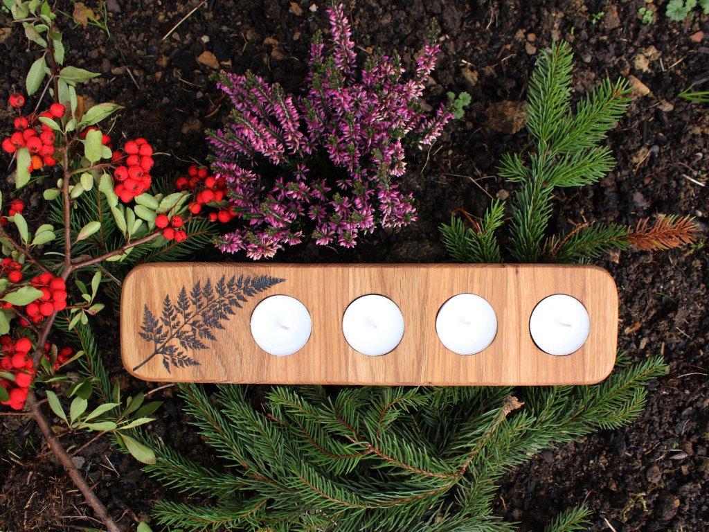 Dřevěný svícen na čtyři čajové svíčky. Povrch je ošetřený směsí olejů a včelího vosku.